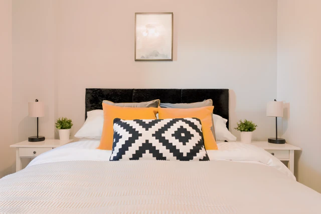 The apartment contains two uniquely style bedrooms, one with a king size bed, and the second bedroom comprising a double bed with ensuite bathroom. Both bedrooms have large built in cupboards for guests luggage needs.